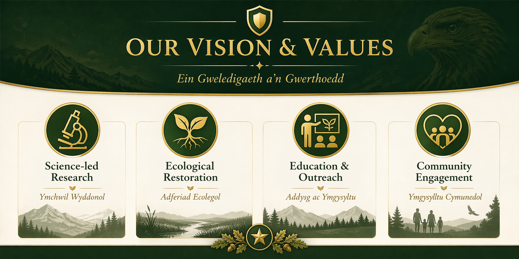 Eagle Reintroduction Wales (ERW) is a science-led conservation programme exploring the return of the White-tailed Eagle (Eryr y Môr) and Golden Eagle (Eryr Euraid) to Wales. Founded in 2016, the initiative brings together research, partnership, and public engagement to assess whether these iconic birds can once again become part of the Welsh landscape. Our vision is to restore ecological balance, reconnect Wales with its natural heritage and inspire future generations to value and protect these remarkable birds of prey.